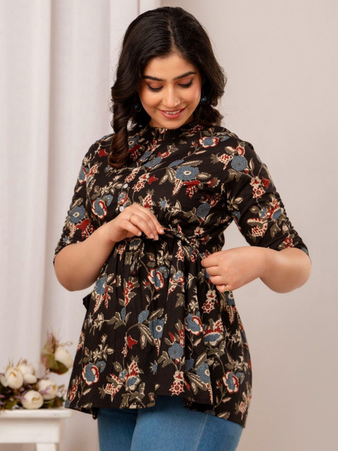 Brown and beige printed tunic ,has a mandarin collar, three-quarter sleeves, tie-ups detail,