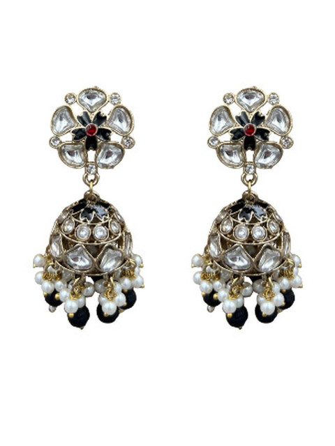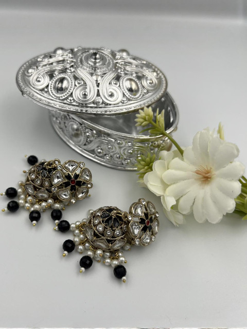 Black and white dome shaped jhumkas, brass-plated, has kundan