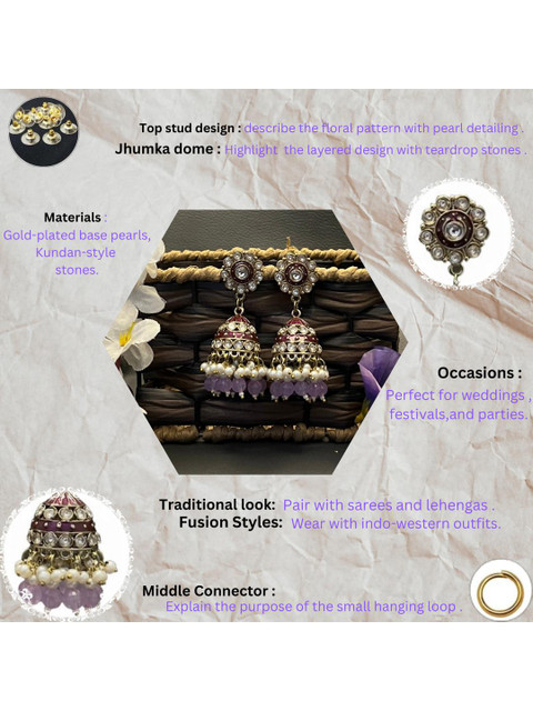 Purple and gold-toned meenakari jhumkas, brass-plated, has kundan.