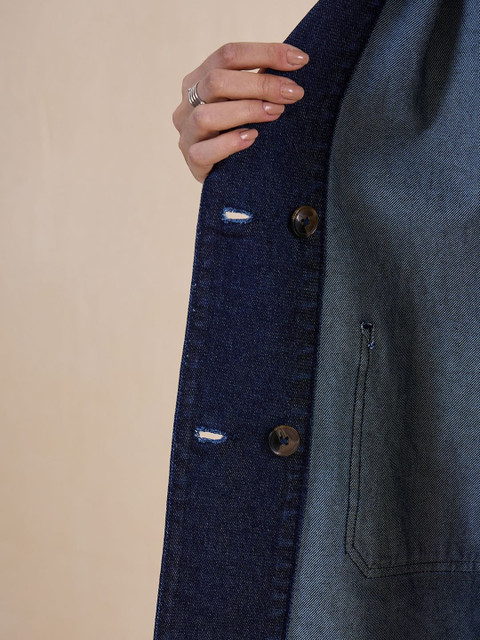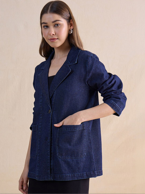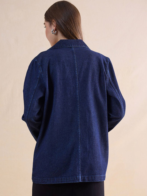 Navy blue solid casual blazer, has a notched lapel, long sleeves, single-breasted with double button closure, two flap pockets, ventless back hem