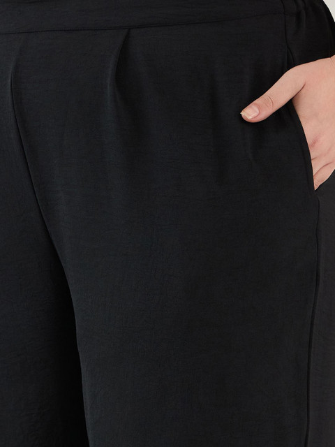 Black solid trousers, has an elasticated waistband with slip on closure has 2 pocket
