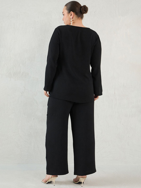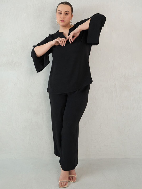 Black solid top, has a notch neck and long slit sleeves, secured with slip on closure