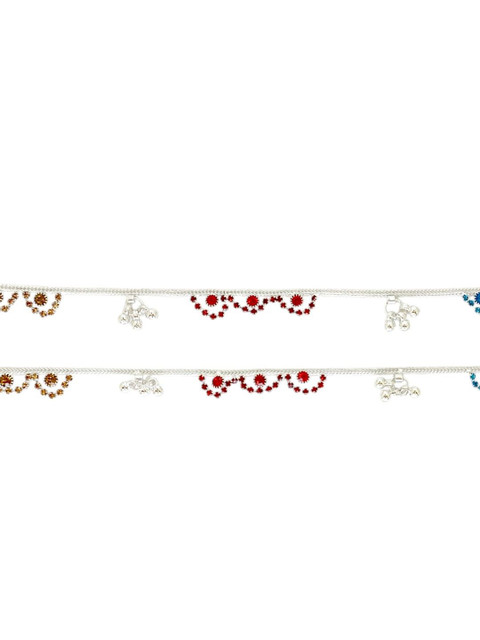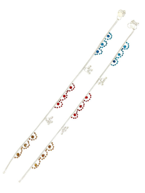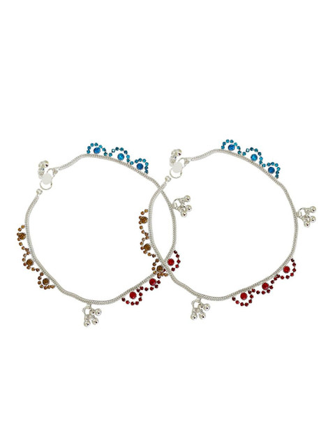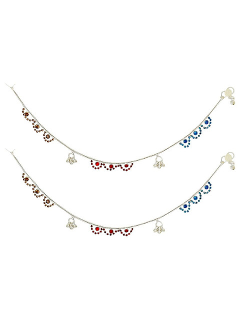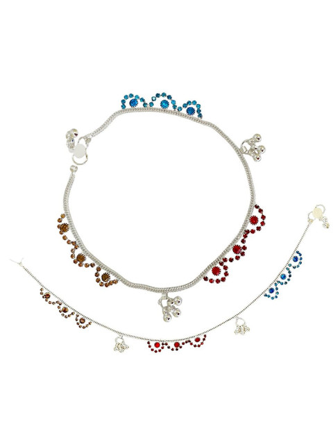Silver-plated, blue and red artificial stones studded anklets