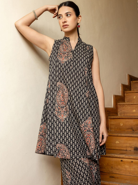 Black printed tunic, has a mandarin collar neck and sleeveless, secured with slip on closure
