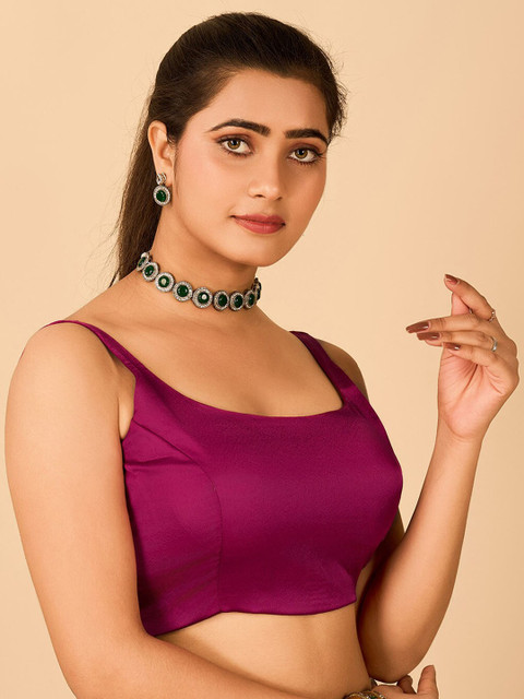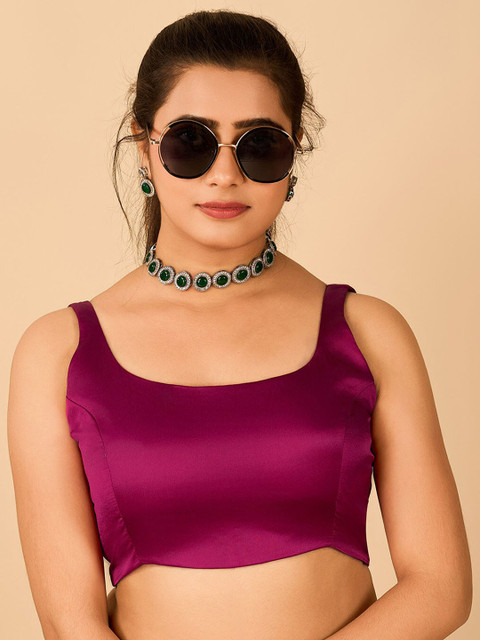 This deep emerald green blouse is a gorgeous standout piece! The rich, jewel-toned satin/silk fabric gives it a luxurious finish that pairs effortlessly with both traditional and festive sarees. I especially love how the minimalist sleeveless design adds a modern edge while still keeping the look classic.