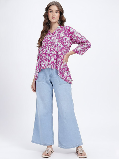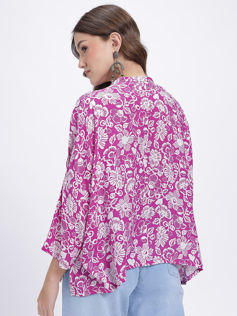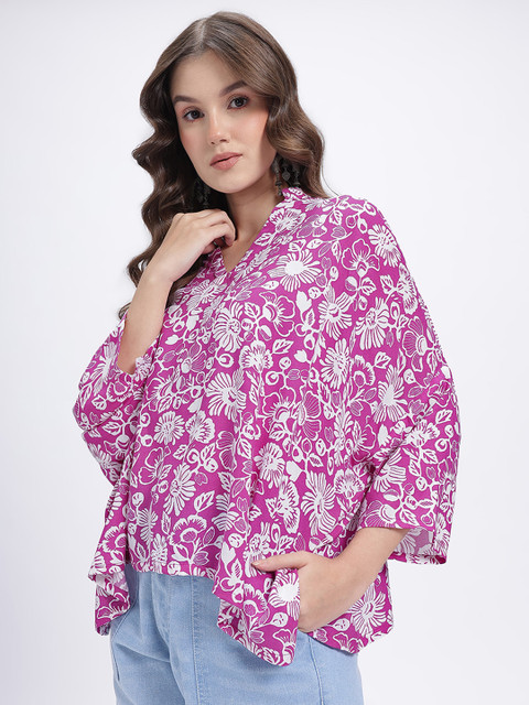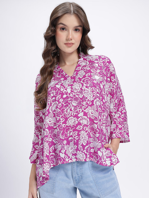 Floral printed V-neck boxy top is a total mood, giving you that effortlessly cool, oversized fit with a chic, vintage-inspired collar that screams main character energy. Color: Pink and white. Neckline: V-neck. Sleeves Styling: Three quarters sleeves.