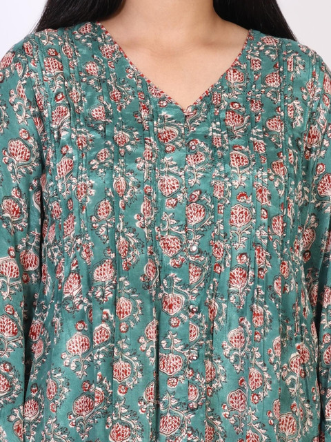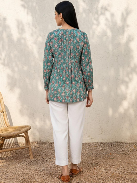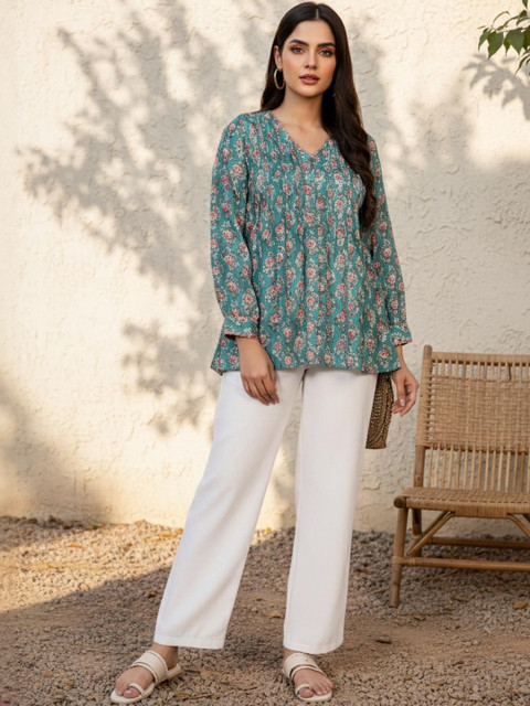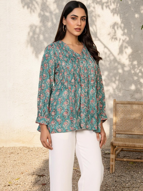 Embrace bohemian vibes with this green floral top. Pair it with white trousers and sandals for a breezy daytime look or dress it up with statement earrings for a festive gathering.