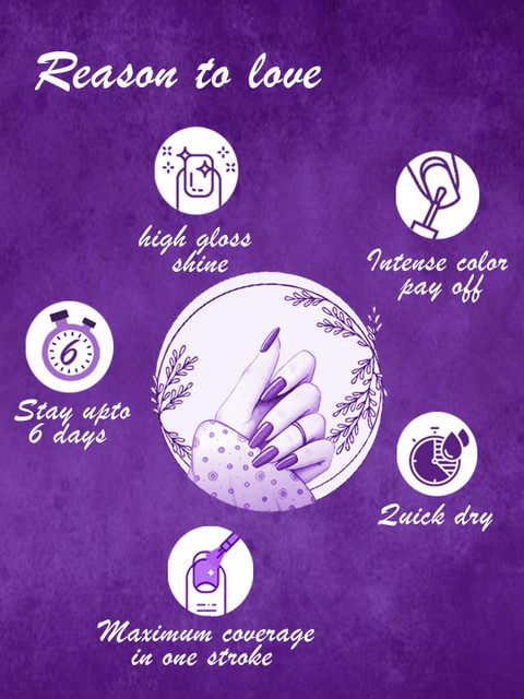 | Benefits | Smooth applicationMaximum coverage in 1 strokeStay up to 6 hoursIntense color pay offHigh Gloss shineLong wearQuick dry |