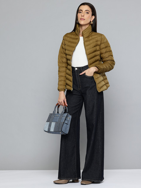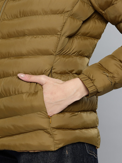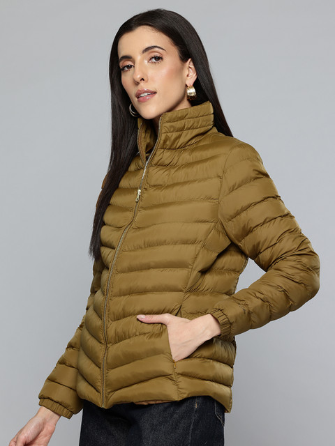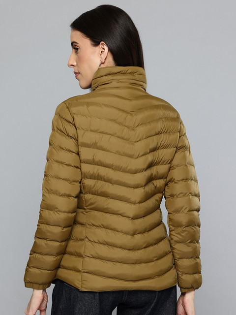 Olive green solid puffer jacket, has a mock collar, 3 pockets ,has a zip closure, long sleeves, straight hemline, polyester lining