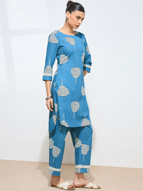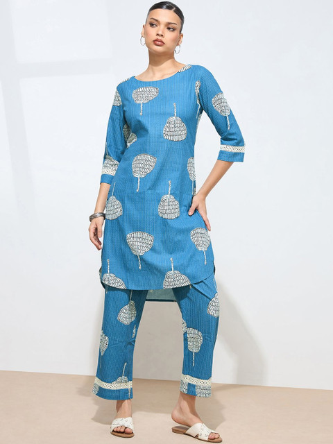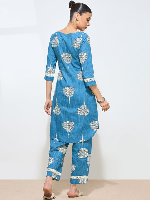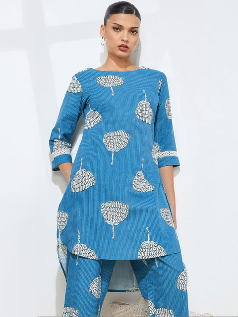 Blue and white printed top, has a round neck and three-quarter sleeves, secured with slip-on closure