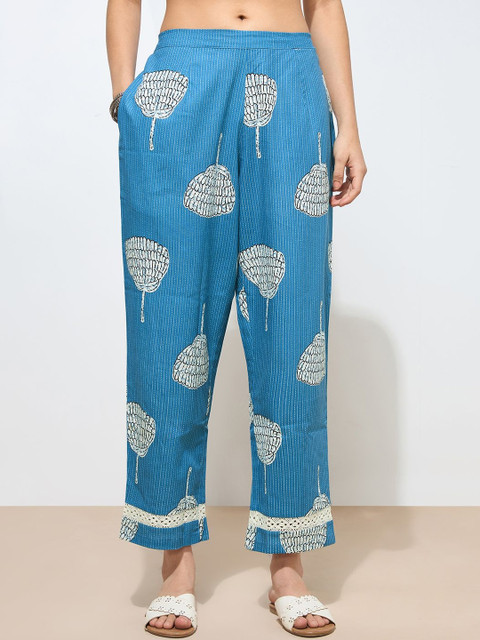 Blue and white printed trousers, has an elasticated waistband with slip-on closure