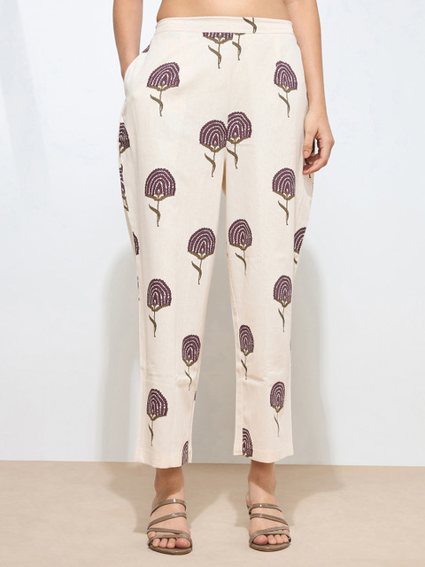 Red and white printed trousers, has an elasticated waistband with slip-on closure