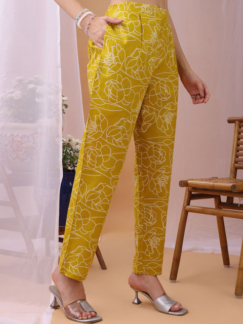 Mustard-Yellow printed trousers, has an elasticated waistband with slip on closure