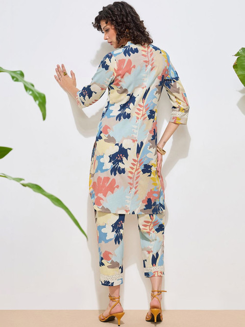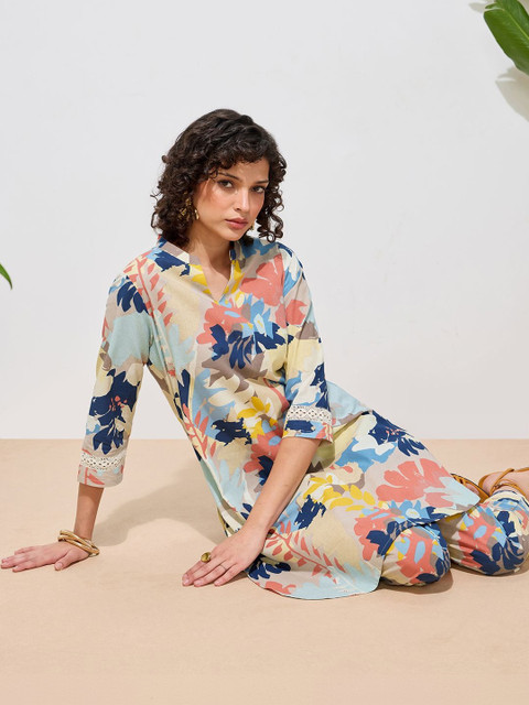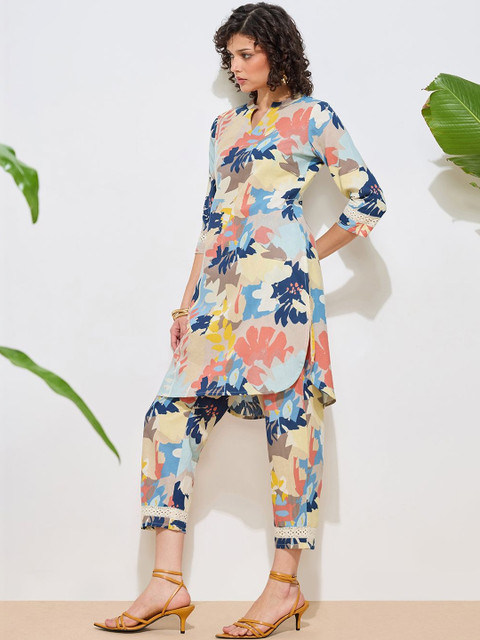 Orange, white and pink printed top, has a v neck and three-quarter sleeves, secured with slip-on closure
