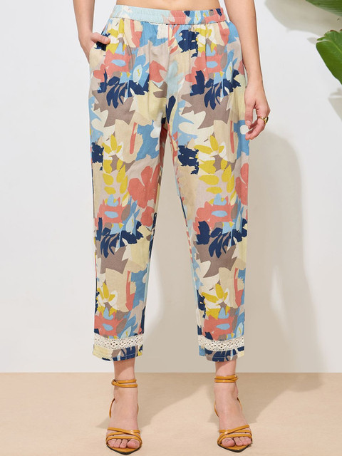 Orange, white and pink printed palazzo, has an elasticated waistband with slip-on closure