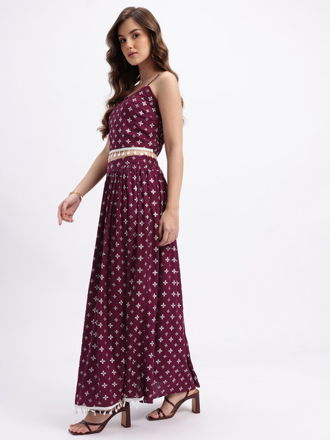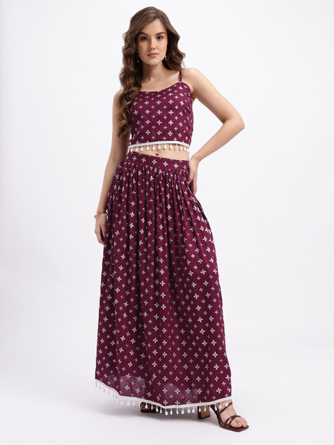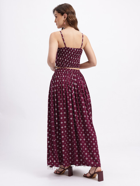A geometric self-design crop top with floral detailing paired with a midi slip on skirt for a coordinated, sculpted look that blends structured geometry with fluid, wrap-friendly movement.