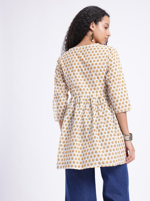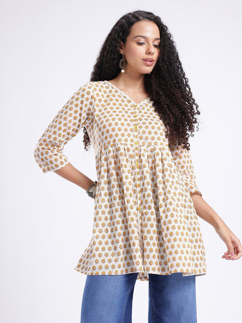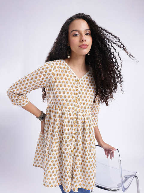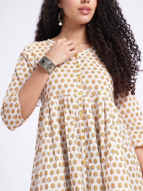 Discover the beauty of botanical prints in this stylish V-neck A-line kurti. Detailed with an elegant button placket, this piece combines traditional charm with modern wearability. Its relaxed A-line fit ensures maximum comfort and a flattering drape for all-day wear.