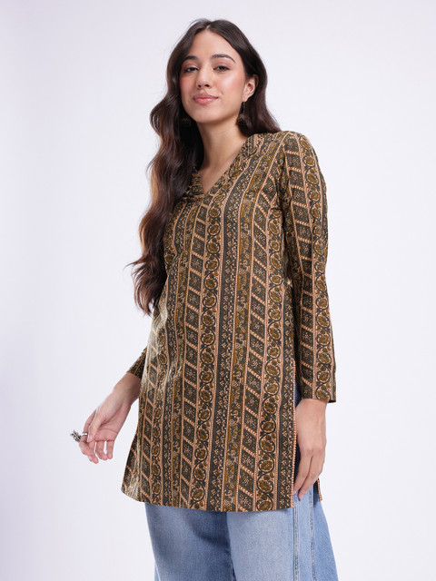 Stay cool and stylish in this pure cotton straight kurti, featuring a fresh, all-over floral print. The comfortable, breathable fabric and flattering V-neckline make it an effortless choice for everyday summer wear.
