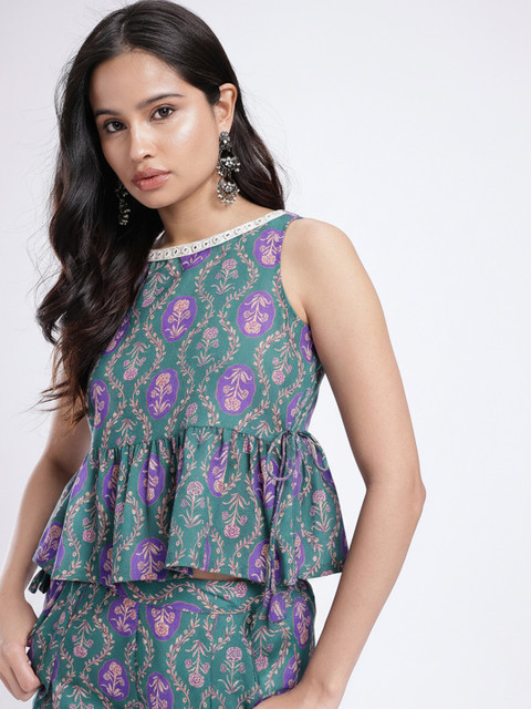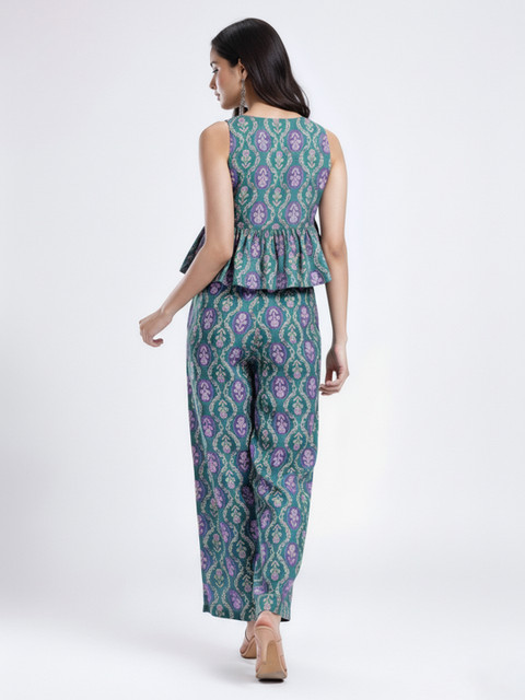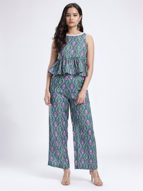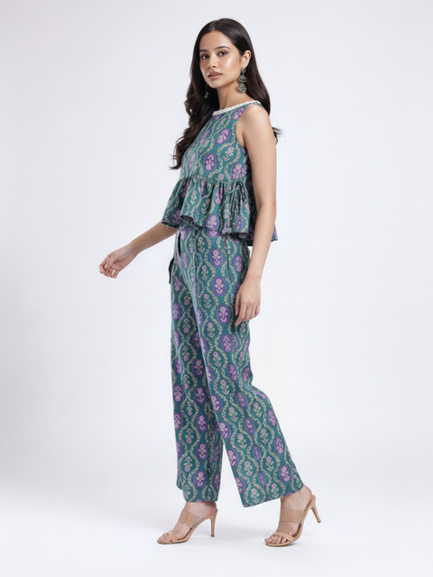 A statement of synchronized, effortless style, offering a complete outfit with luxurious detailing. This coordinated ensemble, typically consisting of a matching top and bottom, is characterized by its cohesive, all-over floral print, which provides a fresh, feminine, and vibrant foundation.