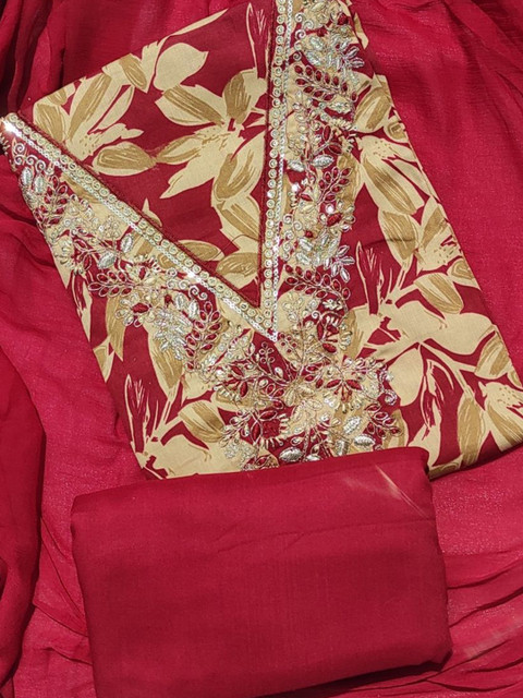 Red and beige printed unstitched dress material