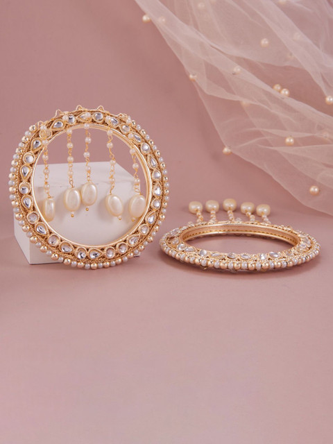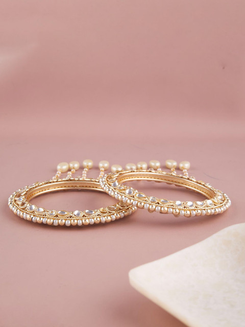 Set of two gold-plated bangles, each has kundan-studded & beaded details, secured with slip-on closure