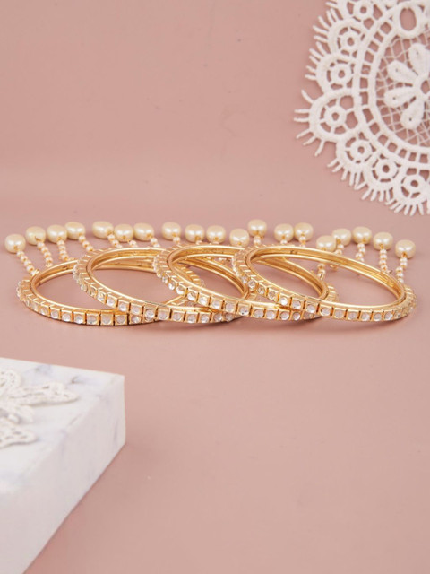 Set of four gold-plated bangles, each has kundan-studded & beaded details, secured with slip-on closure