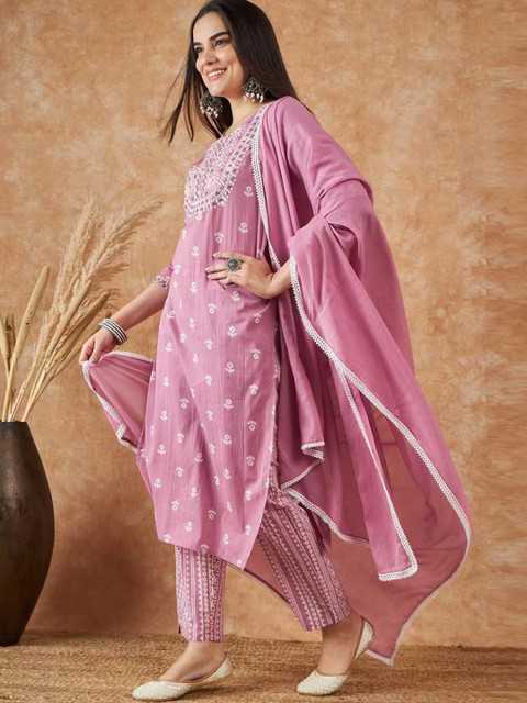 3 reviews for GEN Z TRENDS Women Pink Embroidered Thread Work Cotton Rayon Kurti Pant Dupatta Set
