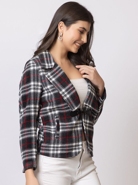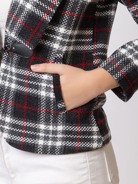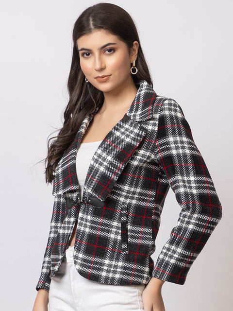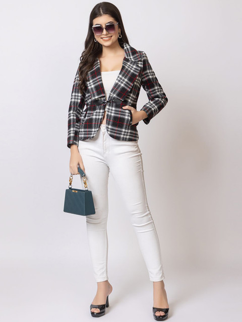 Black self design regular-fit casual blazer, has a notched lapel, long sleeves, single-breasted with double button closure, two flap pockets, one welt pocket and a double-vented back hem