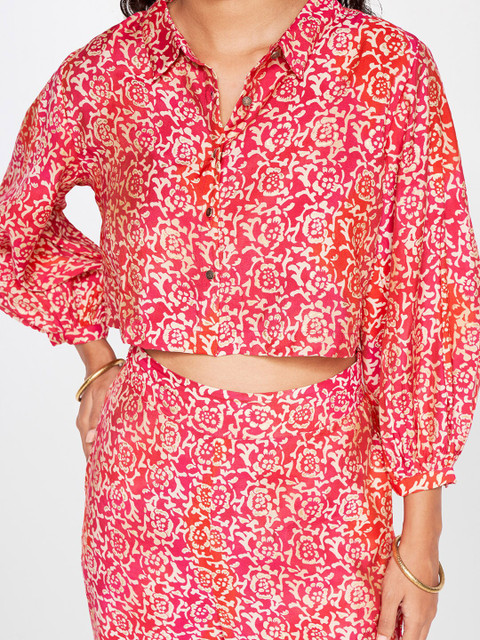 Red printed top, has shirt collar neck, long sleeves, slip-on closure