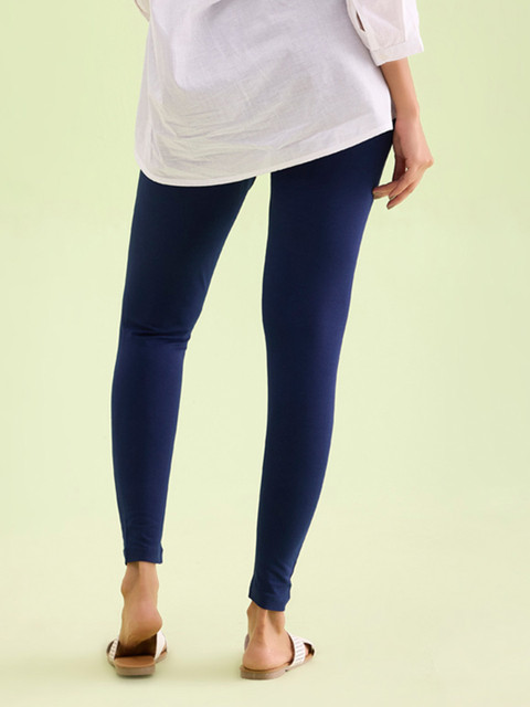 A pair of navy blue solid mid-rise ankle-length leggings, has an elasticated waistband with a slip-on closure.