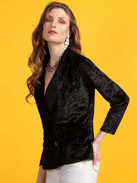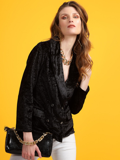 Black self design regular-fit blazer, has a shawl collar, long sleeves, double-breasted with double button closure, two flap pockets, double-vented back hem