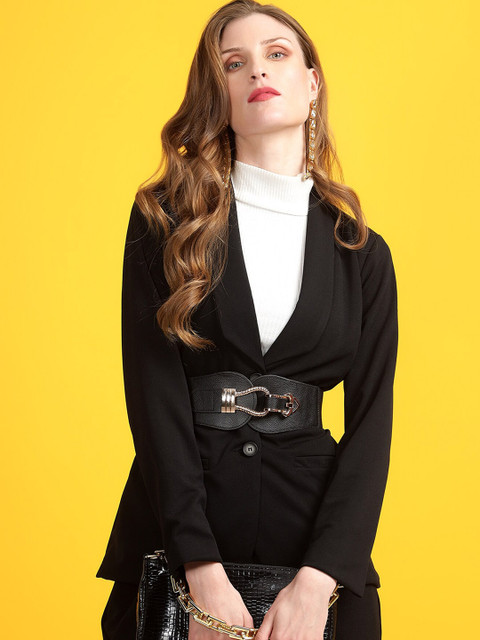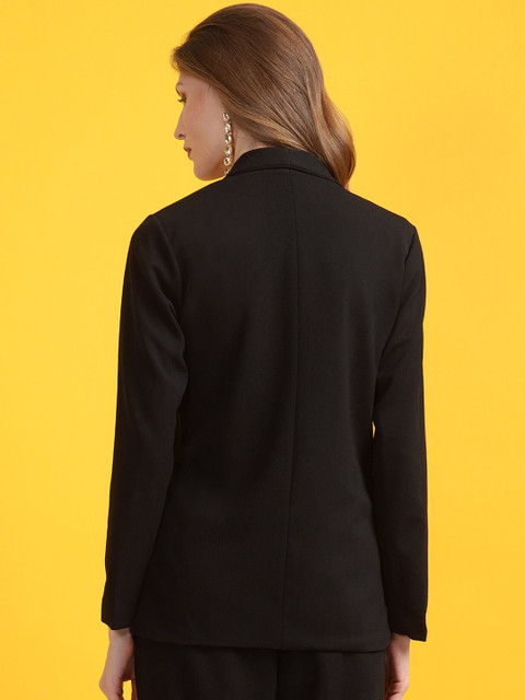 Black solid tailored-fit formal blazer, has a shawl lapel, long sleeves, single-breasted with double button closure, two flap pockets and a double-vented back hem
