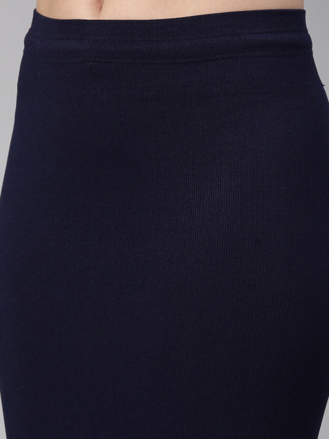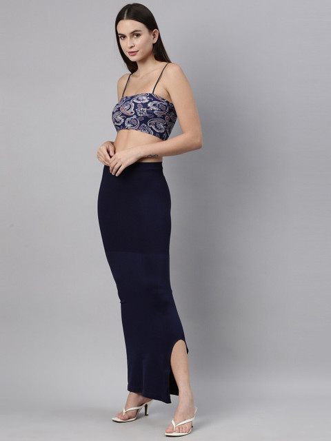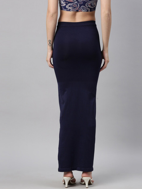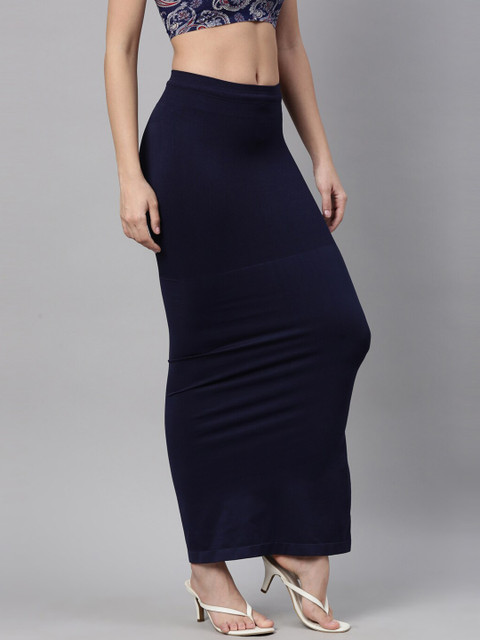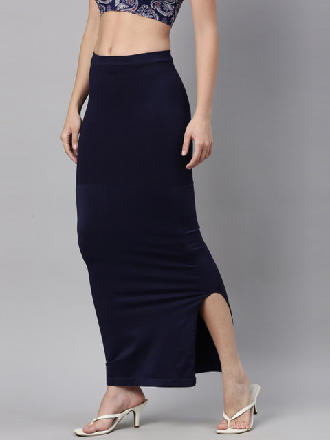 Navy blue ribbed saree shapewear, has an elasticated waistband with inner drawstring closure, a slit and straight hem