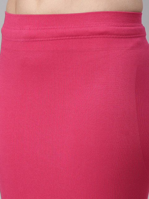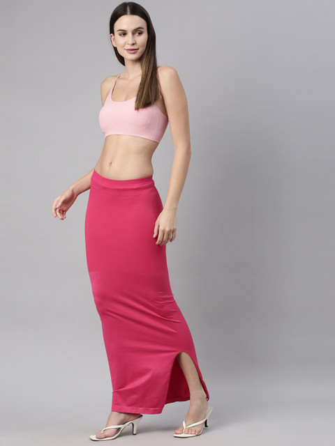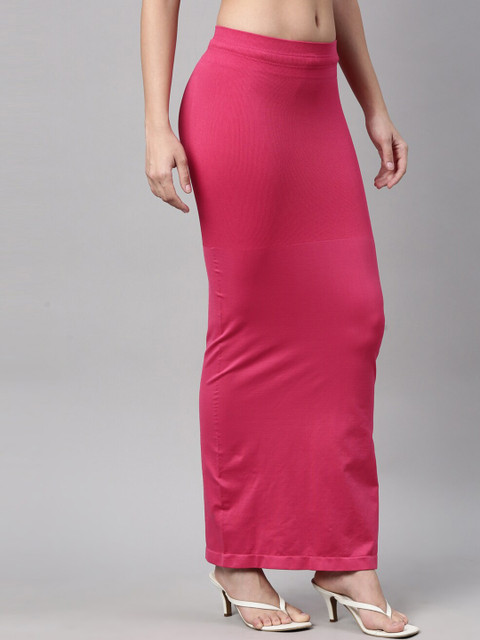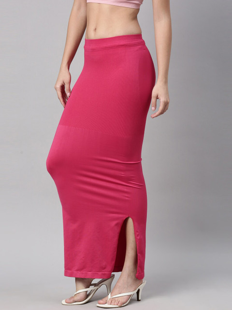 Fuchsia pink ribbed saree shapewear, has an elasticated waistband with inner drawstring closure, a slit and straight hem