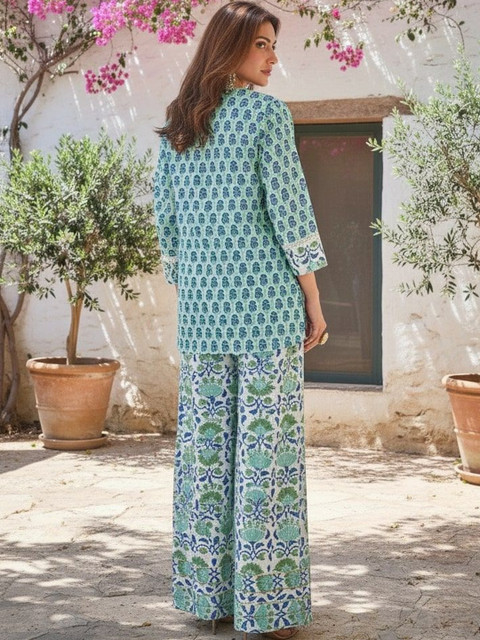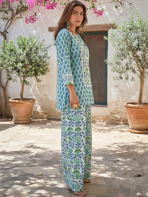 Green, white and blue printed kurta with salwar