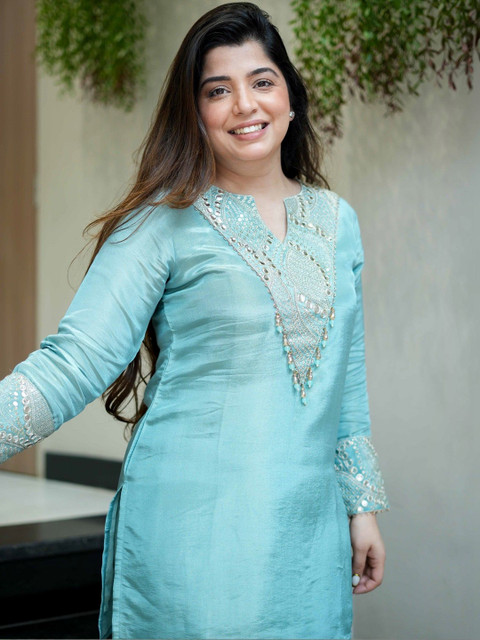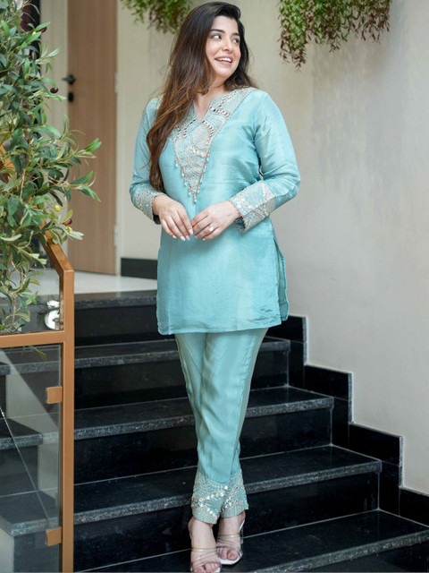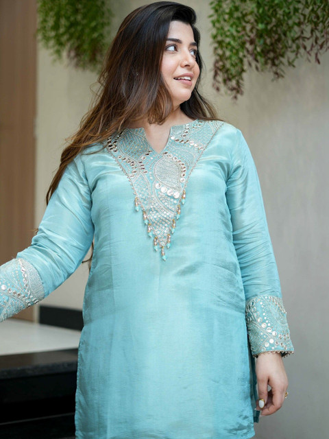 SkyBlue embroidered short top, has a tie-up neck and three-quarter sleeves, secured with slip on closure