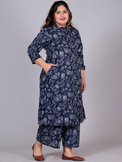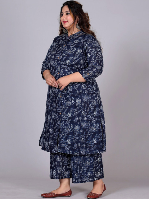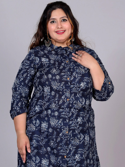Blue and white printed tunic, has a mandarin collar and three quarter sleeves, secured with button closure