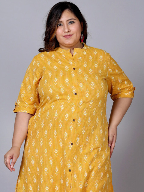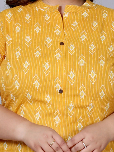 Yellow and white printed tunic, has a mandarin collar neck and three-quarter sleeves, secured with button closure