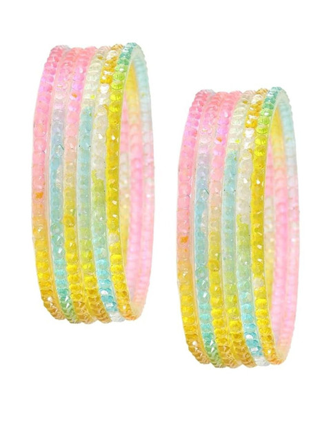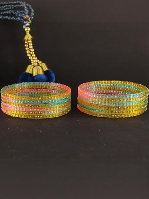 Add a touch of traditional elegance to your attire with this stunning set of 12 glass bangles. These bangles feature an exquisite crystal design, complemented by a sophisticated inner lining that adds a subtle pop of colour. Each bangle in this set is meticulously crafted with intricate detailing, creating a perfect harmony of classic and contemporary style. The glass construction offers a delicate yet durable accessory that’s perfect for both everyday wear and special occasions. These bangles can be coordinated with traditional Indian outfits or modern western wear, making them versatile accessories for your jewellery collection. The set includes multiple bangles that can be worn together for a fuller look or individually for a minimalist appeal. These bangles make for an ideal accessory choice for festivals, celebrations, or any occasion where you want to make a graceful statement.