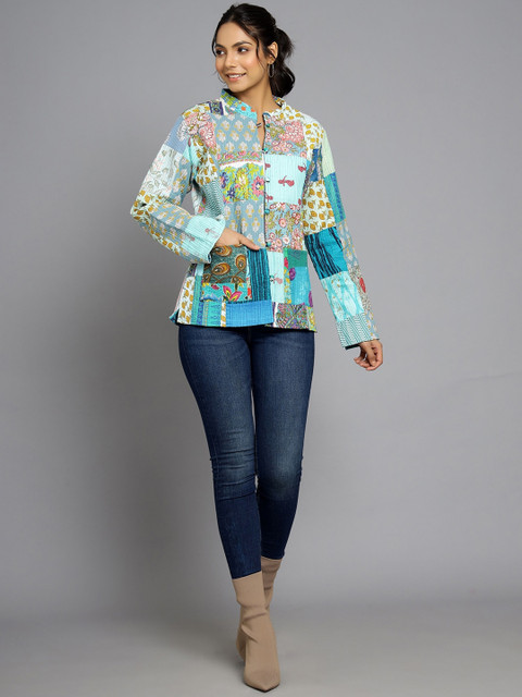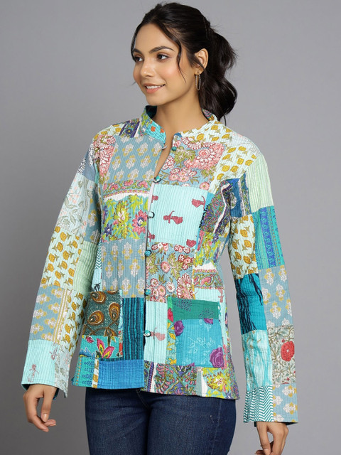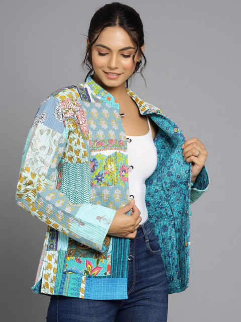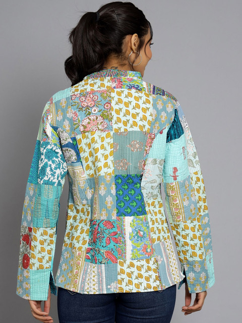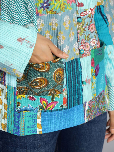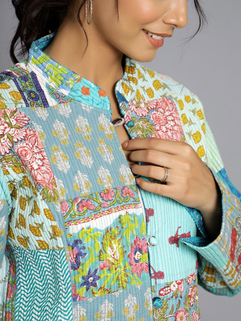 Turquoise blue floral printed reversible tailored jacket with patchwork, has a mandarin collar, 2 pockets ,has a button closure, long sleeves, curved hemline, cotton lining