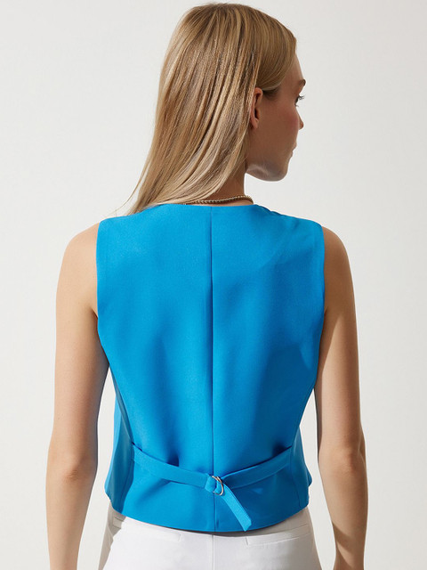 Navy-blue solid regular-fit woven waistcoat, has a V-neck, sleeveless, a full buttoned placket, two pockets
