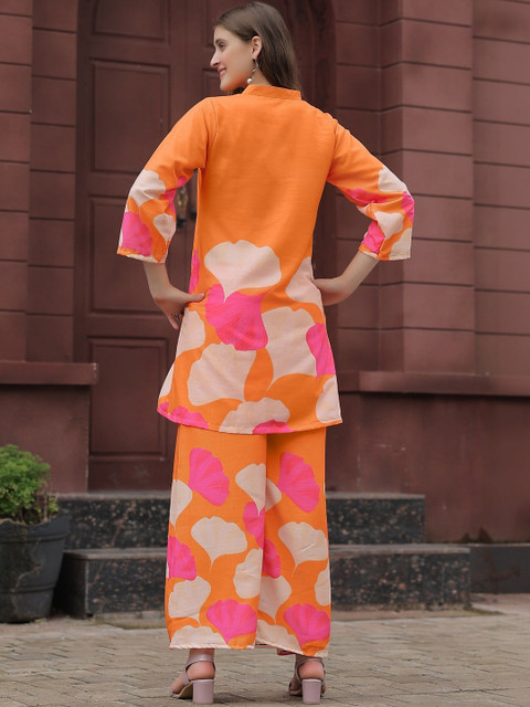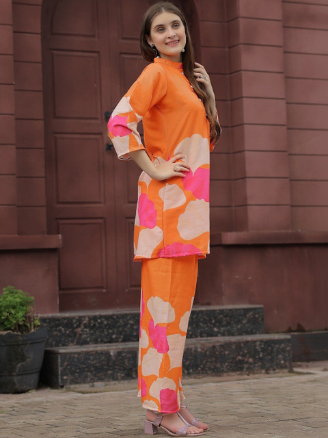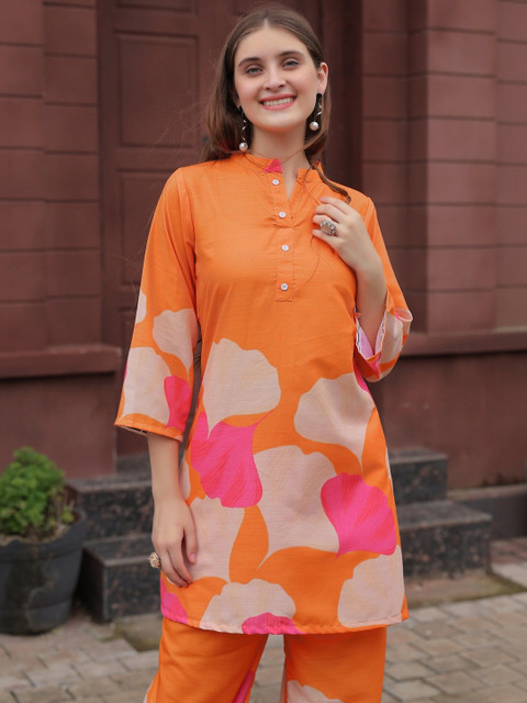 Orange and pink printed tunic, has a mandarin collar neck and threequarter sleeves
