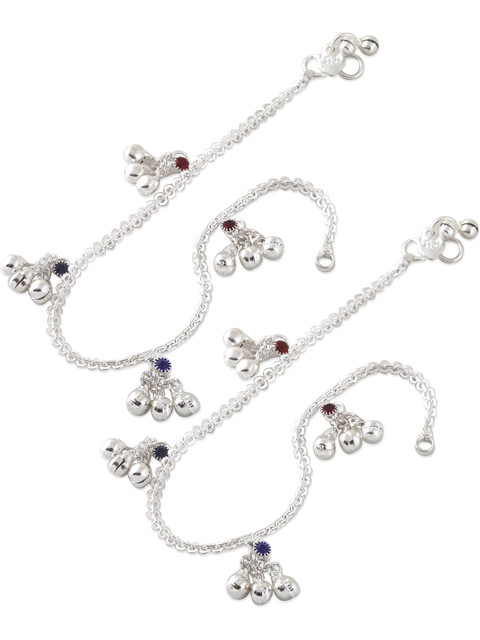 Silver-plated, blue and red anklets, has ghungroo beaded