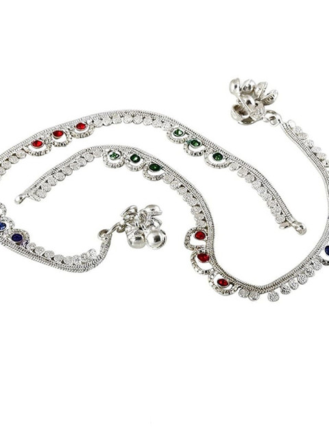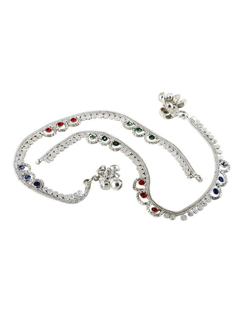 Silver-plated, red and blue anklets, has ghungroo beaded