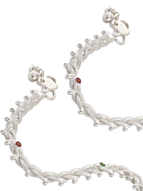 Silver-plated, red and green anklets, has ghungroo beaded