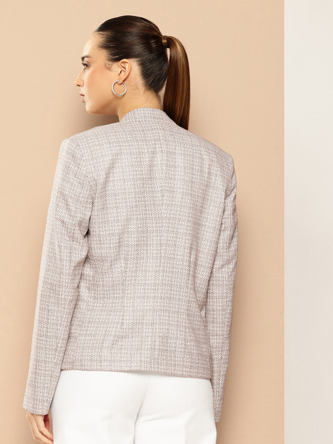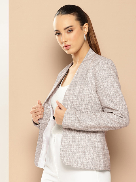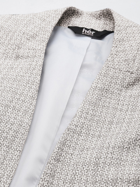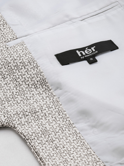 White & black self design regular-fit smart casual blazer, has a collarless, long sleeves, front open, 2 inner pockets & polyester inner lining