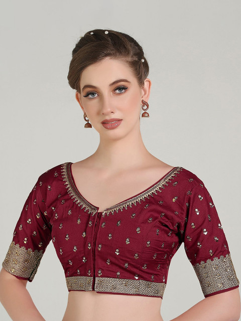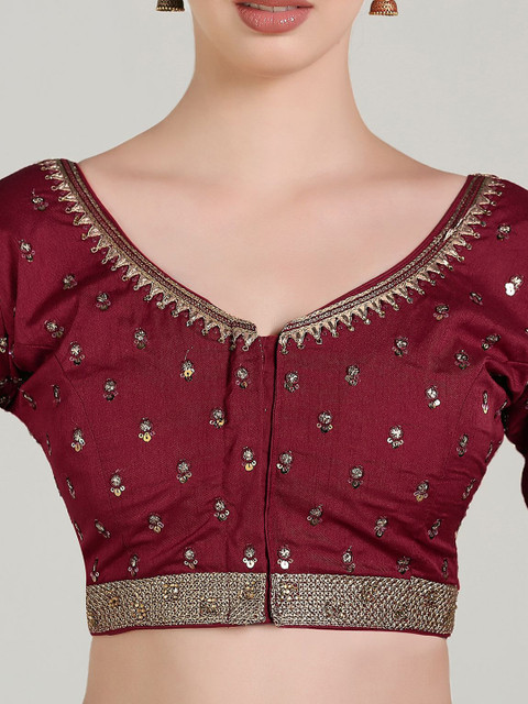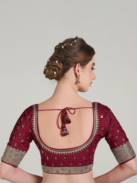 Maroon embroidered blouse has a round neck, short sleeves, and hook and eye closure with tie-up detail