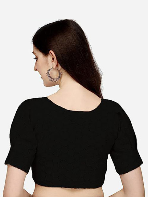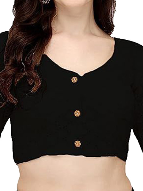 Black chikankari embroidered blouse has a v neck, Short Sleeves, and button closure