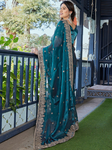 The blouse worn by the model might be for modelling purpose only. Check the image of the blouse piece to understand how the actual blouse piece looks like.