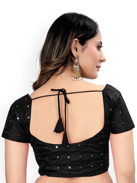 Black embroidered padded blouse has a round neck, short sleeves, and hook and eye closure with tie-up detail
